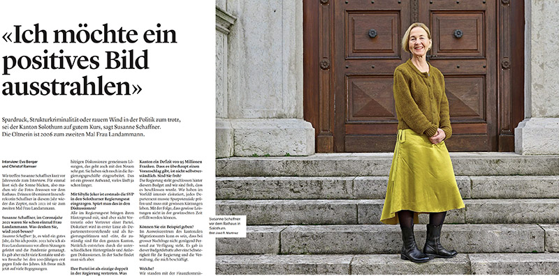 Zum Beginn meiner Amtszeit als Frau Landammann haben Eva Berger und Christof Ramser von der Solothurner Zeitung mir einige Fragen gestellt. Die Überschrift "Ich möchte ein positives Bild ausstrahlen" bezieht sich nicht etwa auf mein "Image", sondern auf das unseres Kantons. Wir sind trotz all der Schwierigkeiten, die ein strukturschwacher Kanton hat, auf einem guten Kurs.